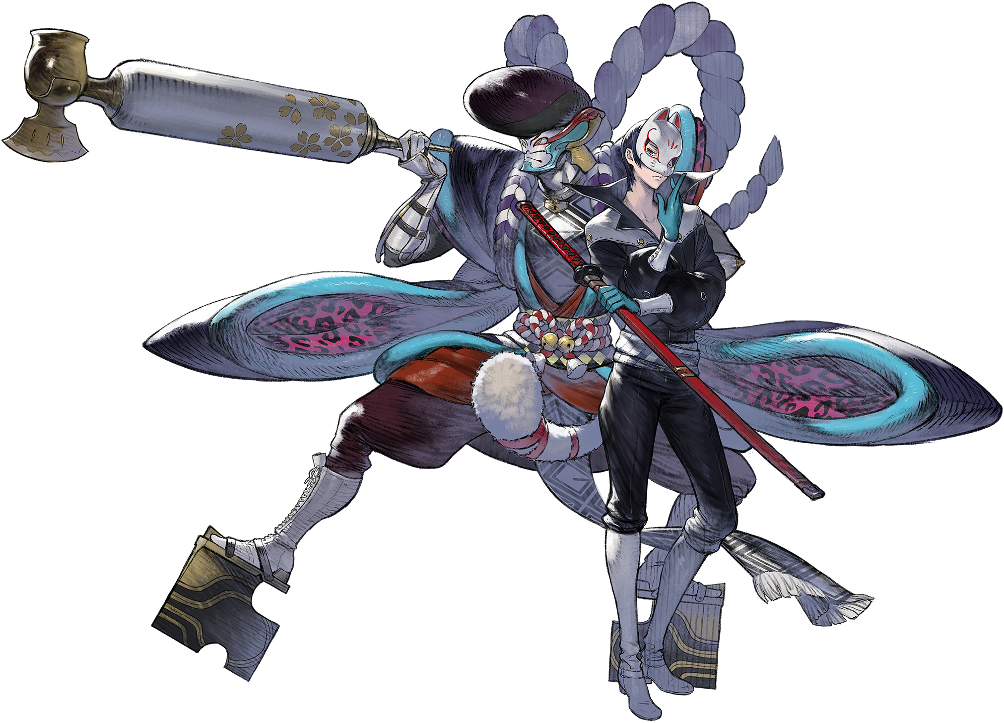 Fox is a young man with dark blue hair and eyes. His outfit consists of a high-collared black jumpsuit with a striped sash worn across his hips, white motorcycle boots, and bright blue gloves. He also dons a traditional kitsune mask and a white tail.