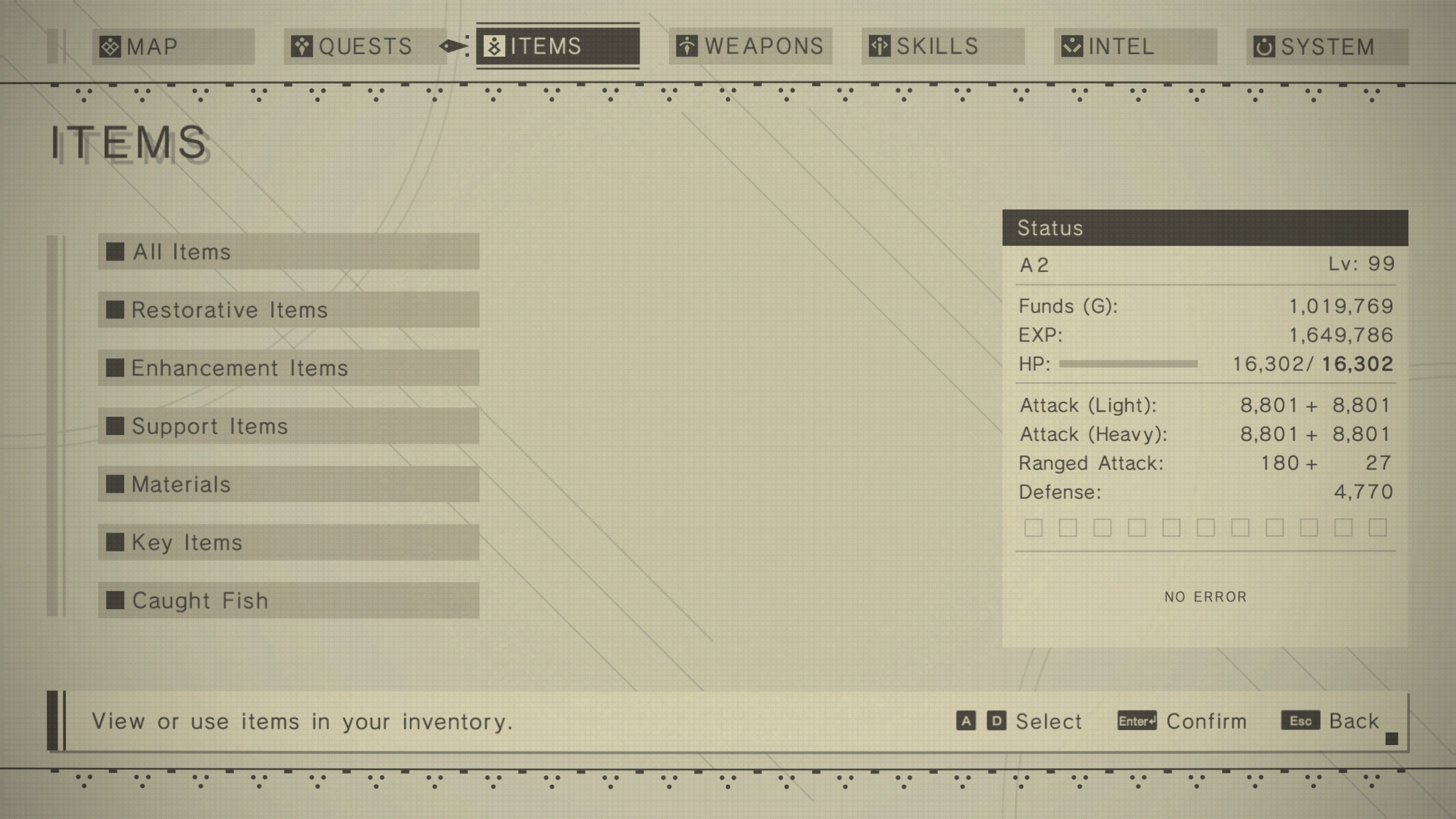 The following is a list of items that appear in NieR:Automata. They can be quest-related, drop from enemies or found throughout the world, and serve different functions.