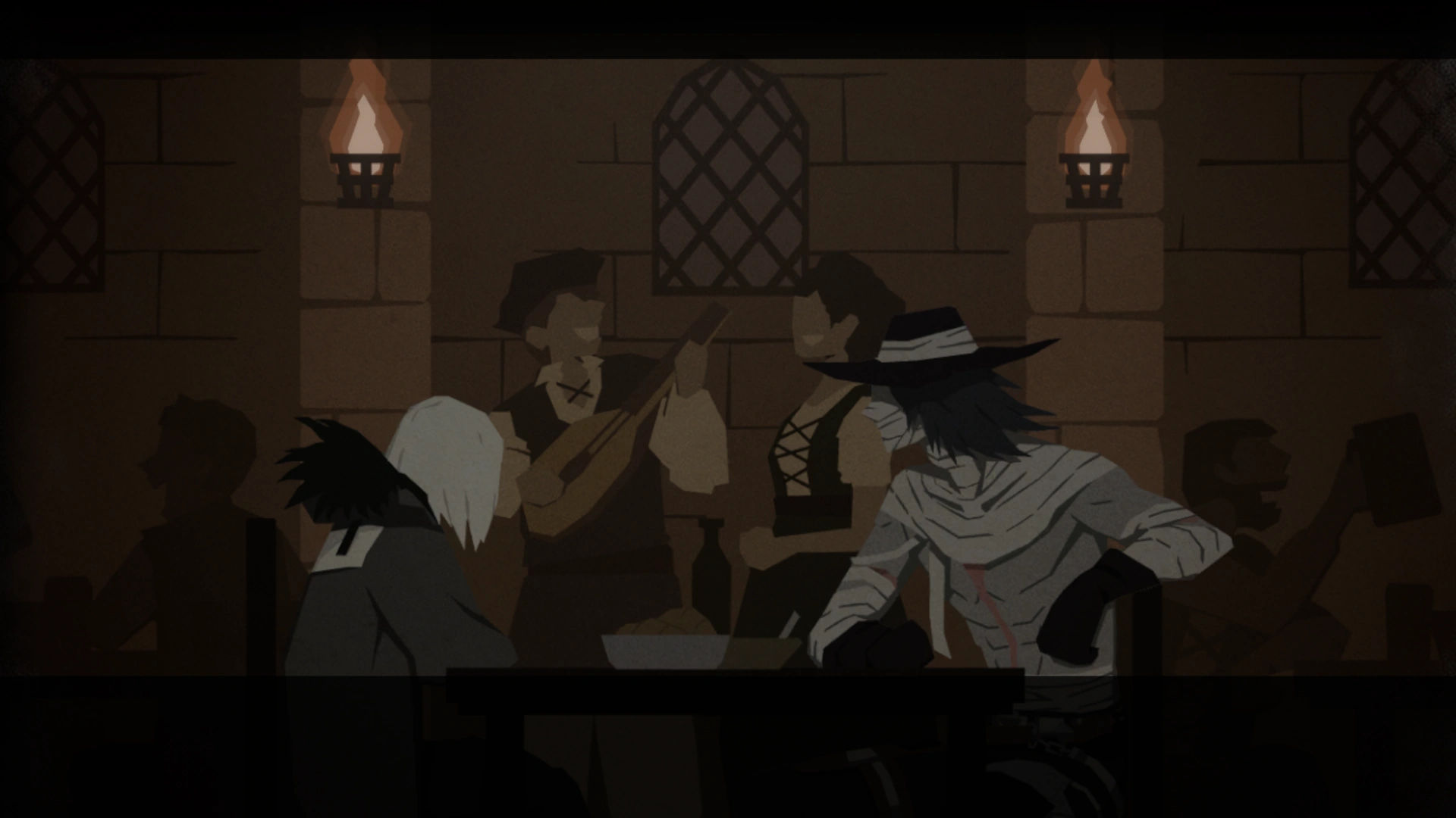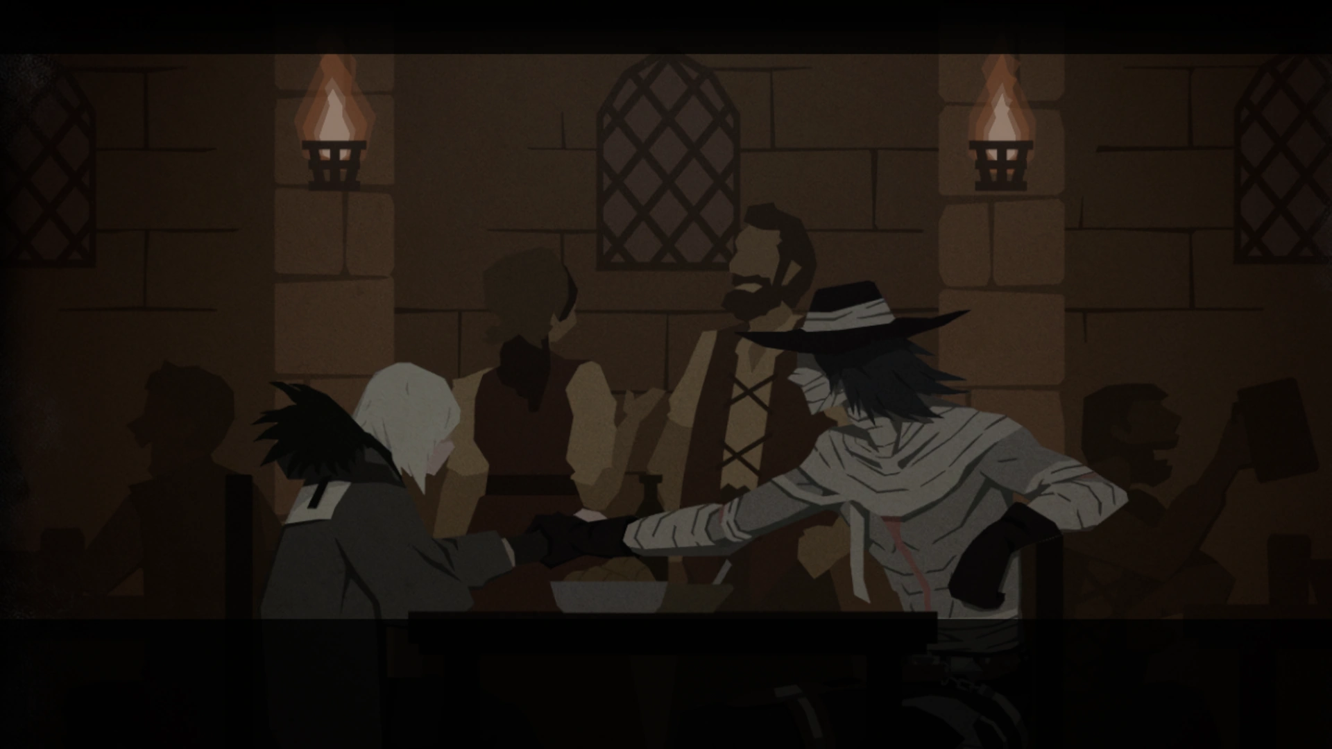 After a bit, they enter a saloon and pause to catch their breaths. The townsfolk are all smiles, and welcome them most heartily. If only I could create a country as peaceful as this, thinks the boy. He thinks back on those ravaged by war in his home country as he reaches across the tavern table for his dinner. Suddenly, his companion's hand flies out. He snatches the food from his fingers and takes a bite.