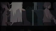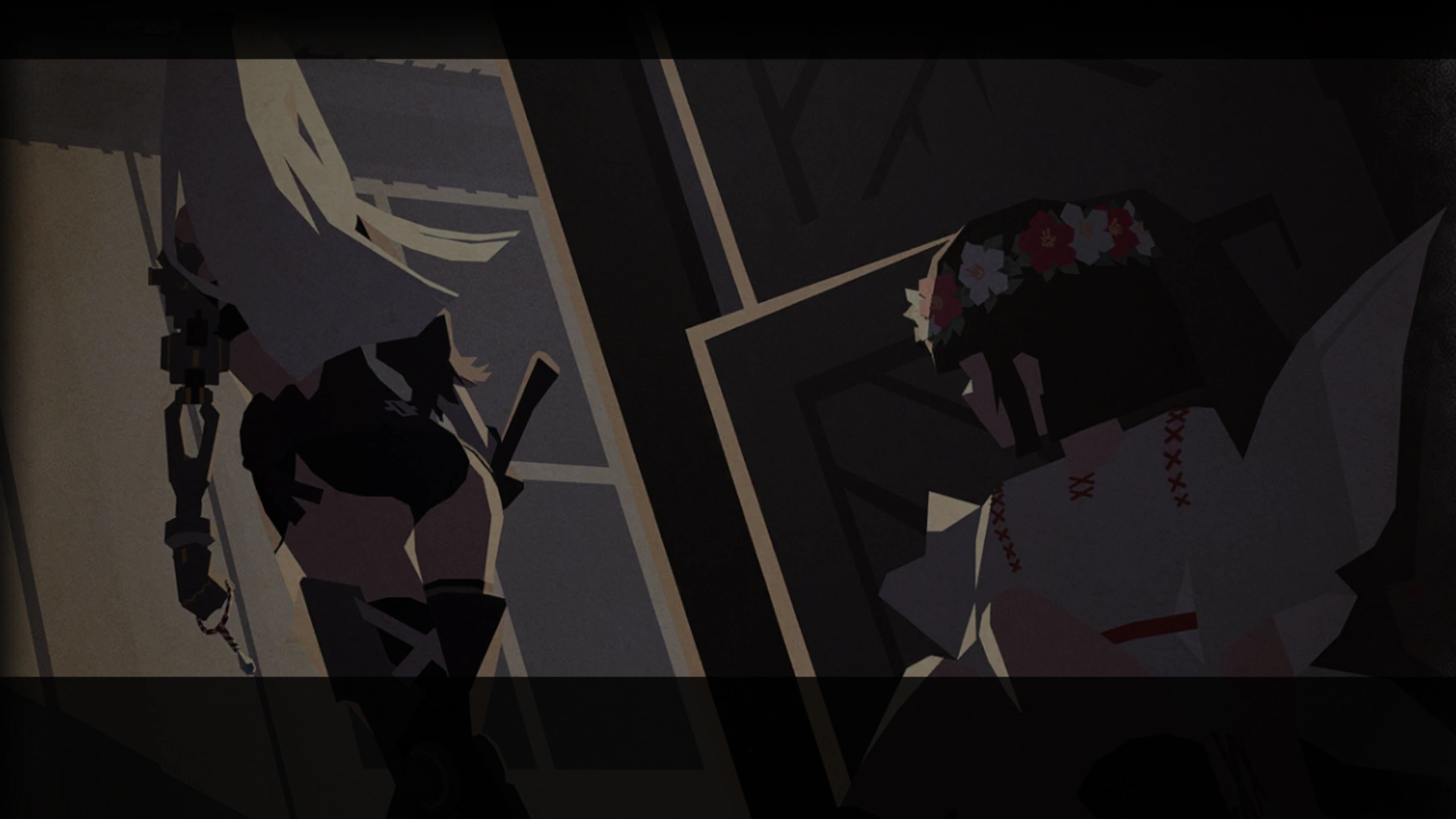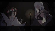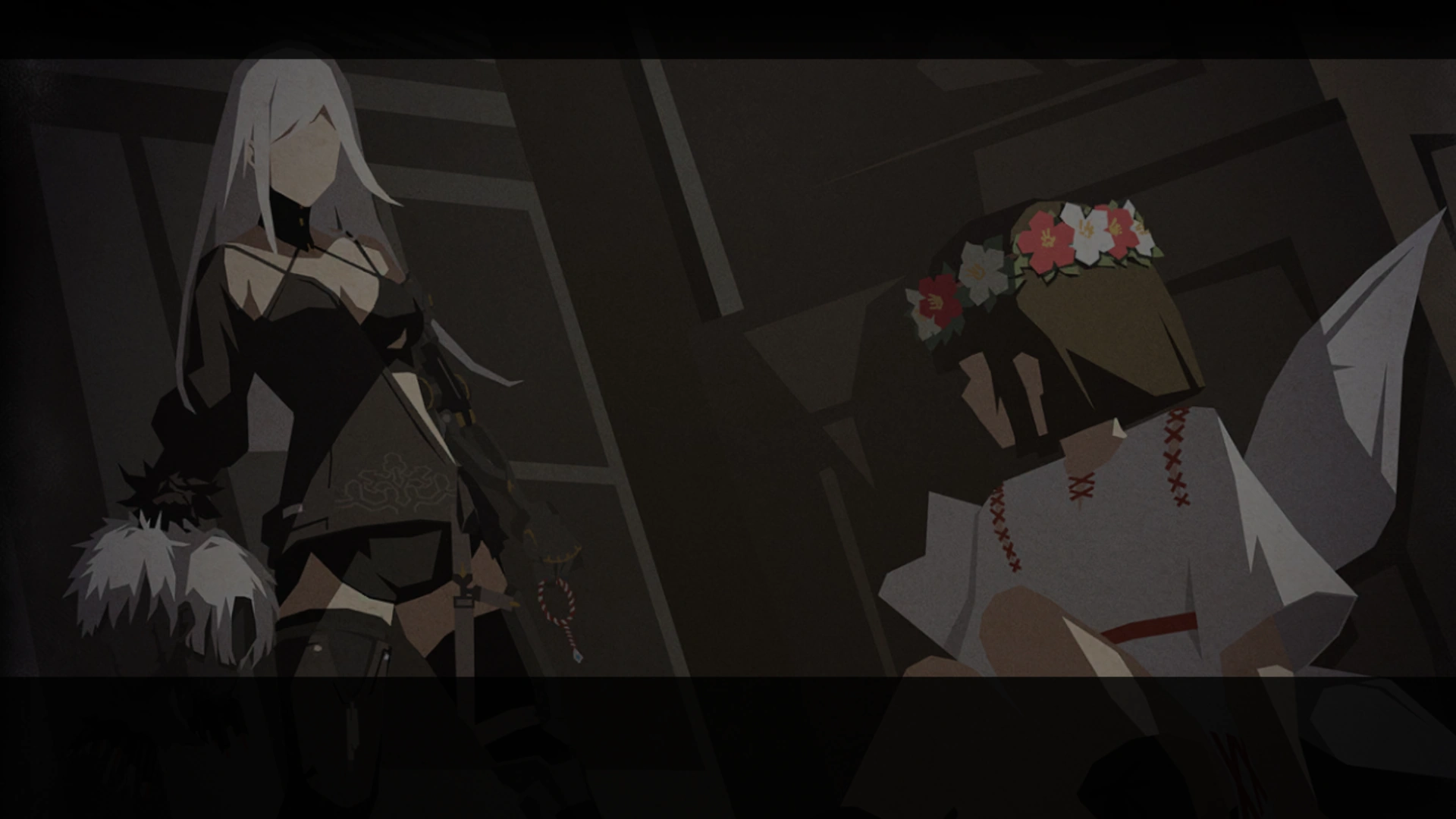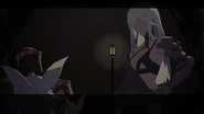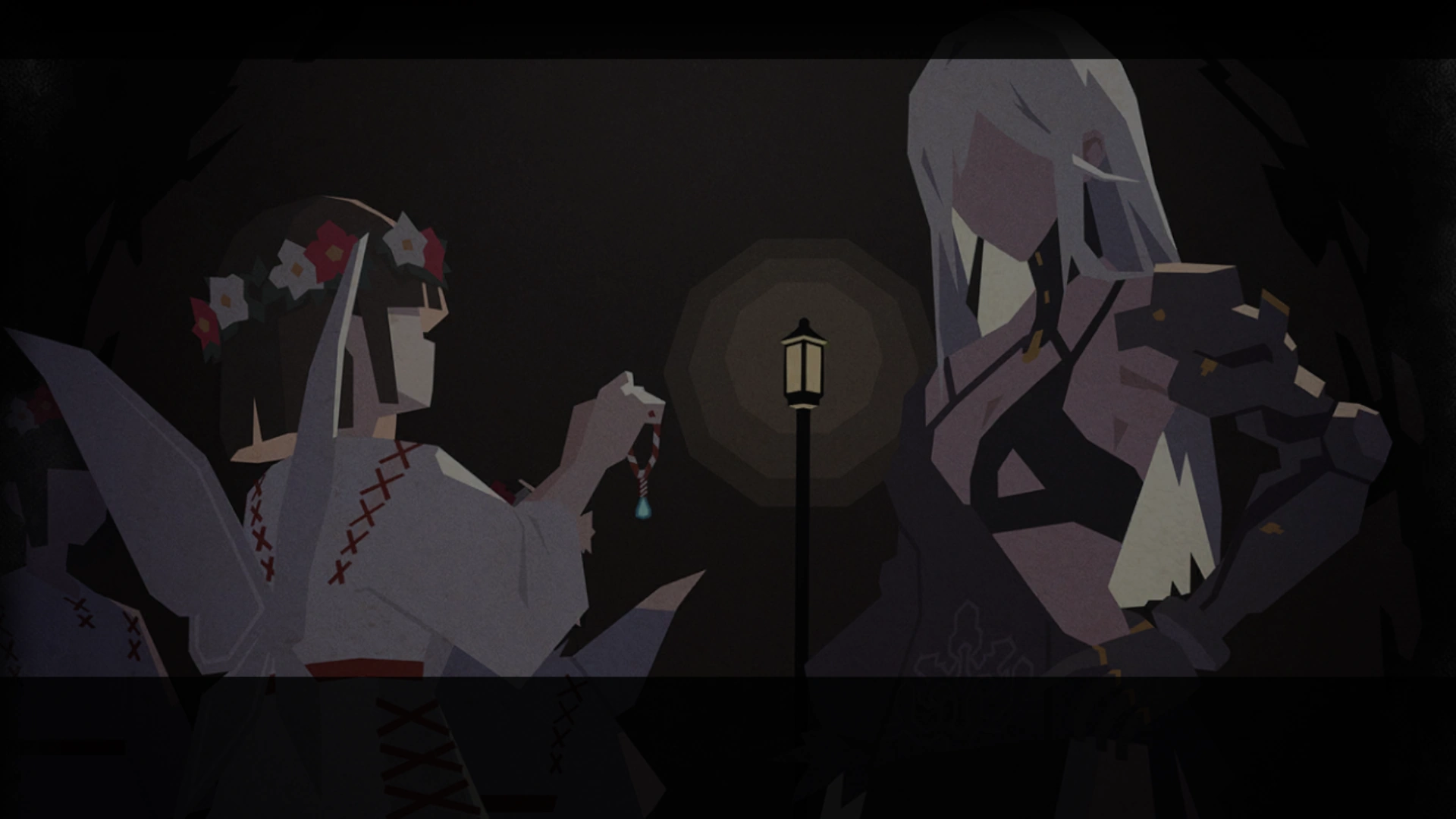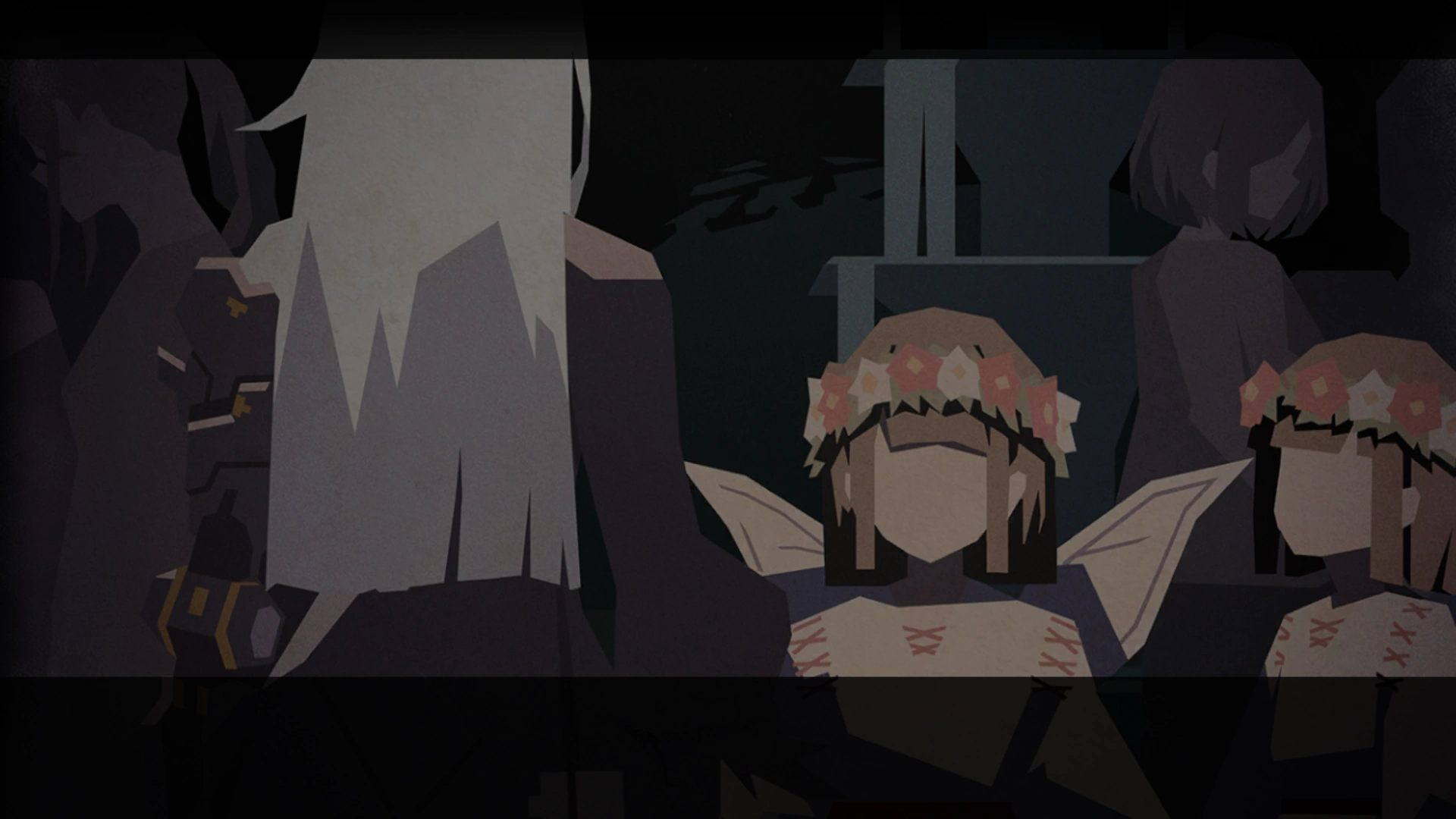 Just as the children's despair is threatening to overtake them, the woman returns. Her body is ablaze in crimson, her breath a series of ragged gasps. In one hand, she grasps a number of severed heads—all that remain of the clockwork soldiers. In her other, she grips a bloody, tattered charm. She speaks then. Softly, but sternly.