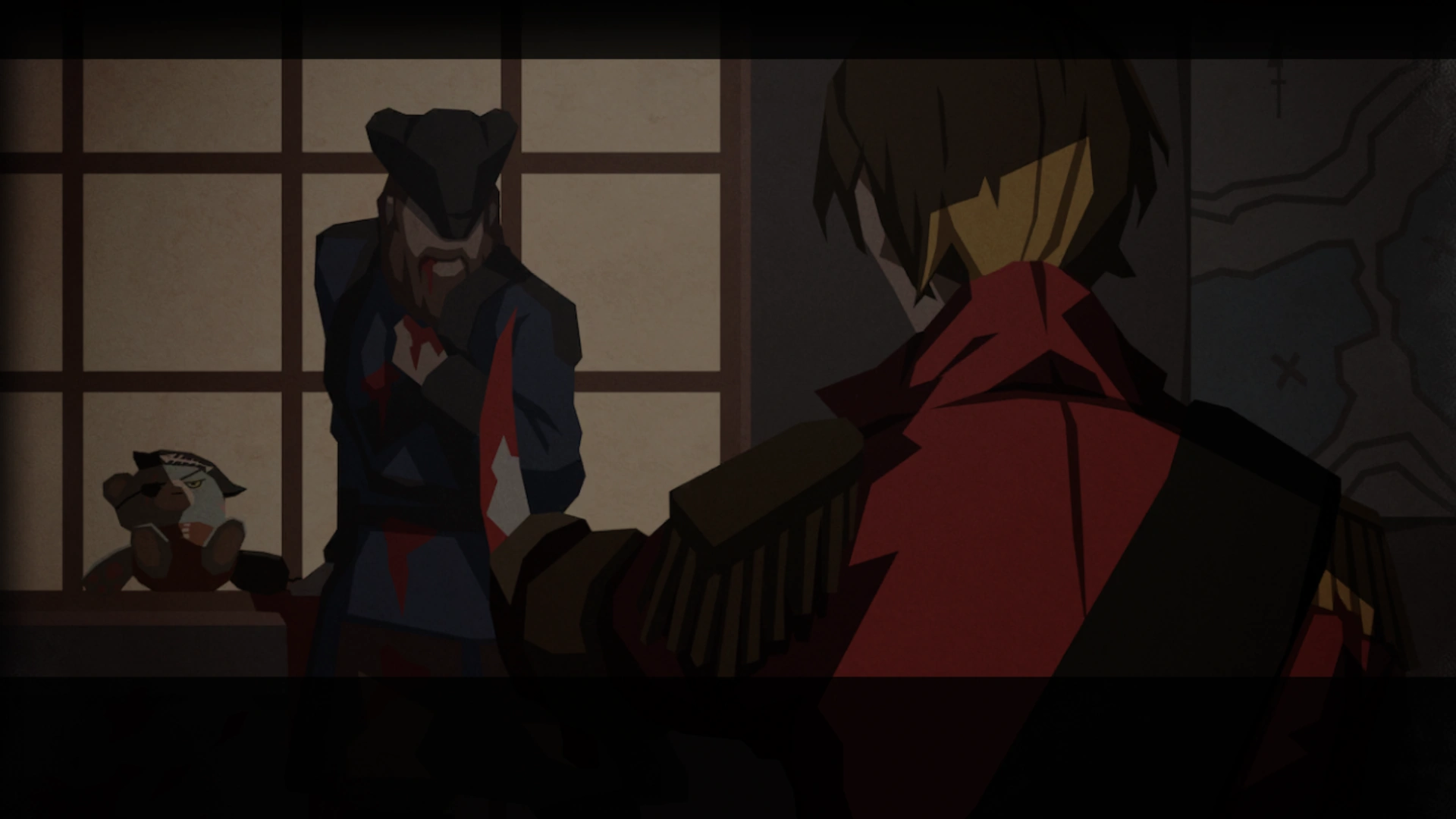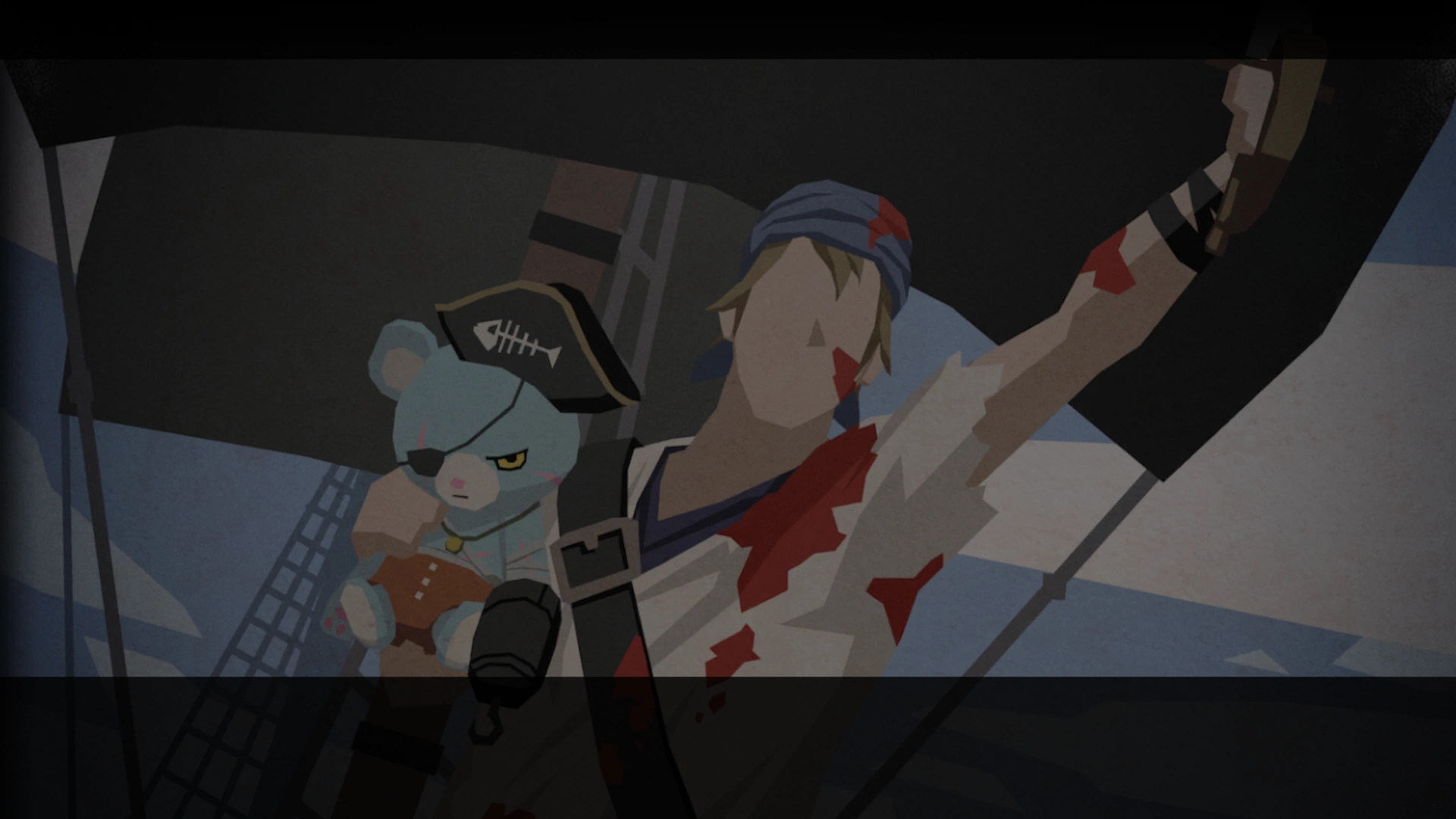 The admiral commands his troops to board the pirate ship. They soon encounter the captain covered in blood; breath faint, eyes empty.