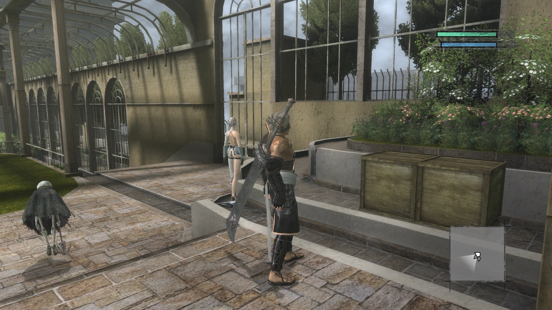 The castle finally becomes available for access as Nier collects the five keys required for unlocking the portal at the top of the Lost Shrine. The party are teleported to an atrium atop a building, where they encounter two talking birds perched on a fountain that act as a safeguard to the door ahead.