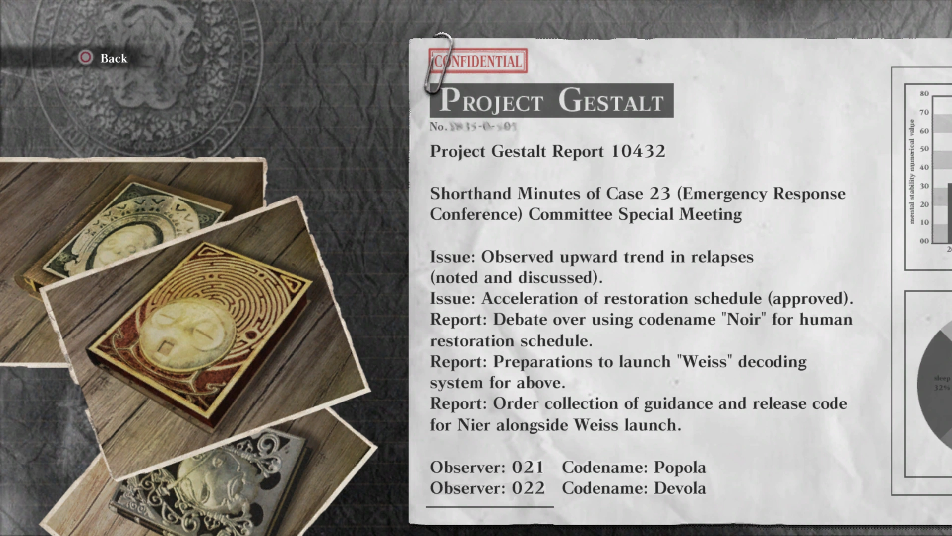 Devola and Popola are faced for the last time in the room ahead, where the two reveal the truth about the world to the party in the form of their notes on Project Gestalt. Weiss then remembers the twins to be androids, specially built to observe the Replicants that had grown to reject their Gestalts—the latter whom the party know as Shades. Devola is killed in the ensuing battle, causing an enraged Popola to self-destruct, taking a chunk of the office room with her and sending Emil's head to the desert. Kainé, however, believes Emil died in the blast, and takes her anger out on Nier before stopping herself.