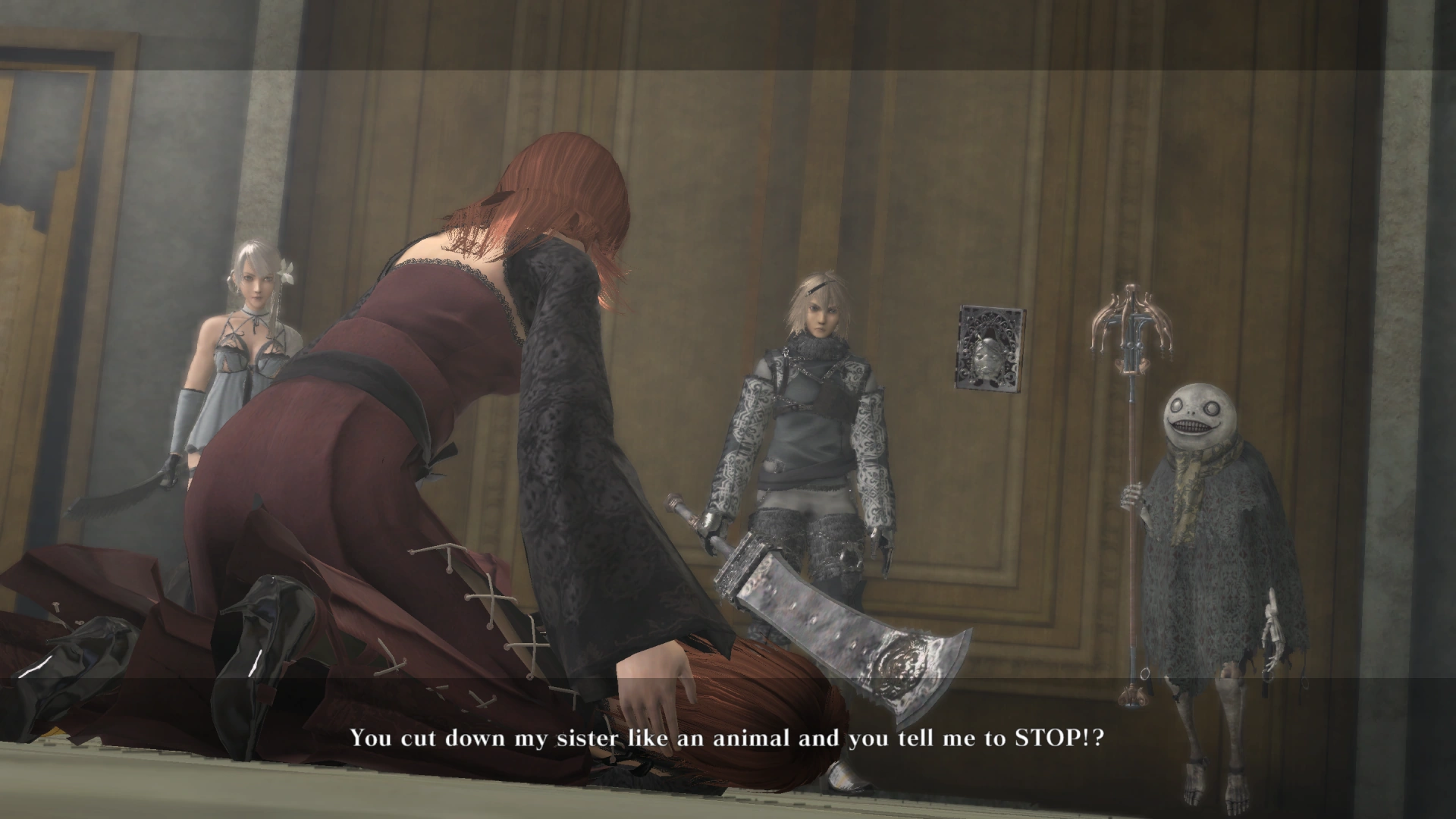 The Shadowlord mounts one final assault before resigning himself to defeat. Nier hesitates for a moment before delivering the killing blow. Unbeknownst to Nier, the Shadowlord was what kept the rest of the stable Gestalts from relapsing. Ending A depicts Kainé's arm acting up, but she brushes it off as her having "shit to take care of". Revisiting the castle after collecting all weapons reveals that she had hardly made it to the door before collapsing, with Tyrann taking over her body once again.