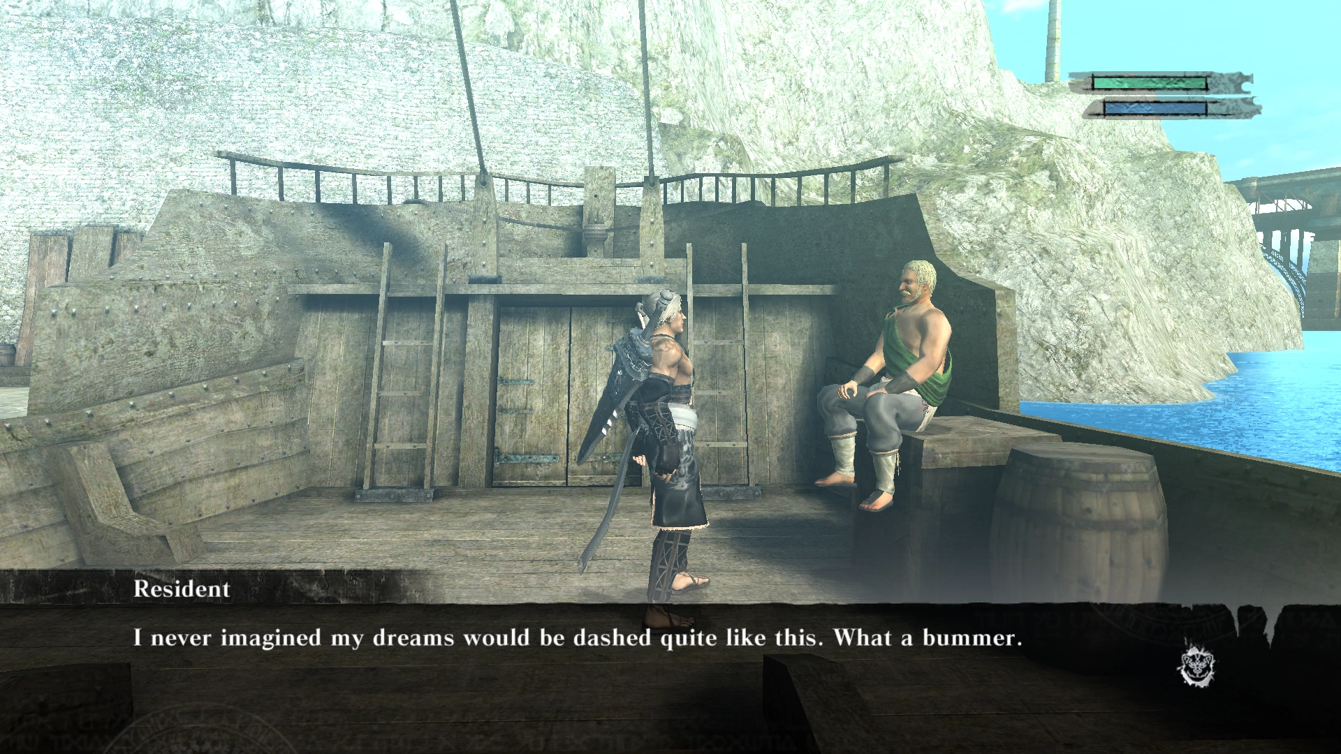 - Speak to the Resident at the docked ship in Seafront after returning to the Village with a Shaman Fish for Yonah.