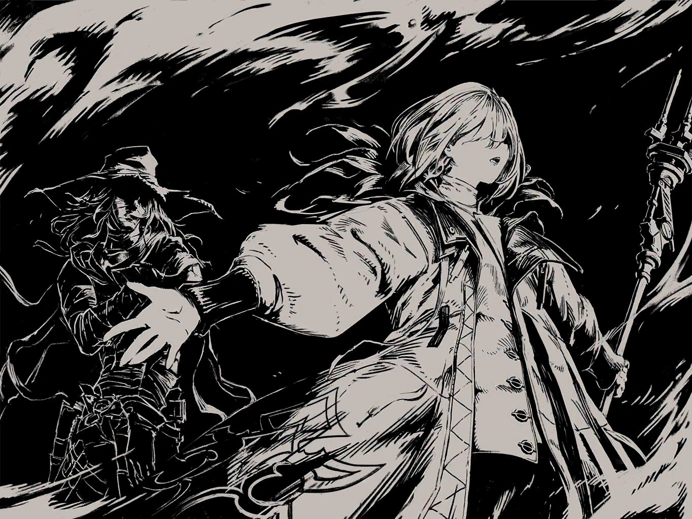 they find a white-haired young woman facing off against the dark foes.