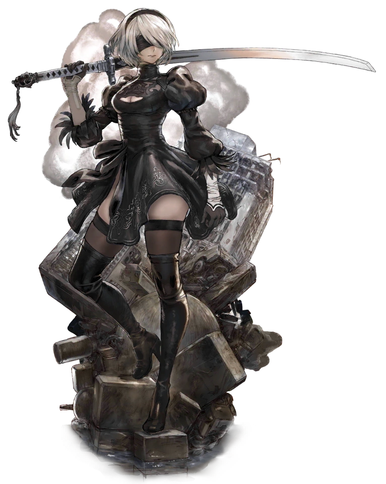 2B is an all-purpose battle android, deployed as a member of the automated YoRHa infantry. She is equipped with a multitude of weapons for close quarters combat and can attack from range using the Pod support system.
