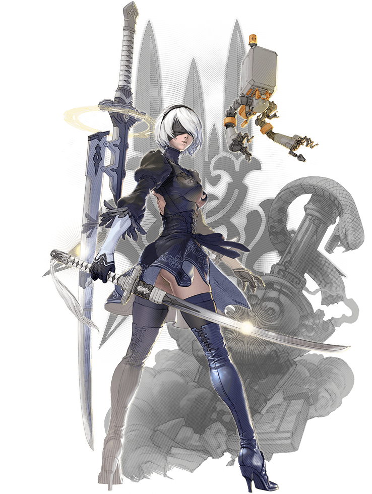 2B appeared as part of a collaboration, available via gacha in the Japanese release during March 2018 and in the Global release during late October 2018, reappearing in mid-November 2018. She is a base 5* ACE Attacker, capable of wielding one-handed swords. Her Type-40 Sword could also be pulled for these same periods. Her Rush Mode attack is YoRHa Arms: Zero, which when activated unleashes 27 hits, increases Attack by a factor of 40 (4000%), and buffers all elemental damage for 20 seconds.