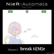 They traverse cities and deserts, leaving the nearby Machine lifeforms alone. As they travel, 2B realizes that her black box is damaged and failing, likely from when A2 killed her to prevent her from fully succumbing to the logic virus. 9S independently figures this out as well, but keeps quiet and continues with 2B in the hopes of finding repairs. As they access more transporters, they realize that the memories create a cipher planted by an unknown party, leading to a secret YoRHa facility known as "Eden". Eden houses the latest research and technology, and potentially the key to saving 2B.