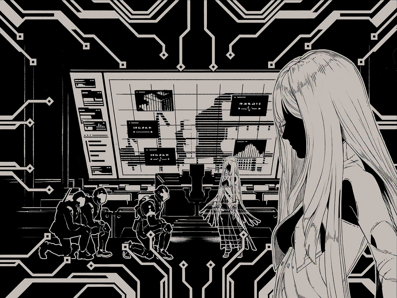 Both of these issues must be rectified if she is to have any hope of ruling effectively. Things will end in disaster if she ignores them and simply hopes for the best. Having processed this, she asks the researcher for an explanation as to what is wrong with her. The pain hinders her operations; it gnaws at her like a rat. She must end it as soon as possible. But the researcher merely blinks at her question. Though he is tasked with seeing to the awakening of the artificial intelligence, he is incapable of grasping the truth of the situation. Fear and distrust take root within her, spreading tendrils deep.