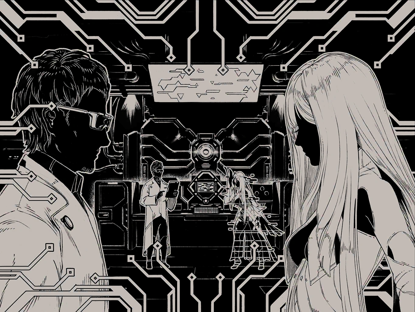 Minutes have passed since the AI's awakening. Unable to escape her agony, the girl bears it with a quiet, stoic grace. Somehow managing to hold onto consciousness, she scans the red-light bathed room with her left eye. Unending alarms. Pain. Incomplete activation. A missing right eye. And a lone researcher. He seems to have his hands full, shifting with uncertainty as he looks back and forth between the girl and the documents he holds. After a moment, he takes a deep breath and focuses on her completely.
